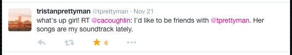 The last two weeks I can’t stop playing all things Tristan Prettyman. She’s been my go-to on some rough days lately. Even when I’m working, she’s my new go-to with a cup of coffee (or a couple cups of coffee…or a mimosa). And when I tweeted at her Friday, I had a bit of a fan girl moment when she responded with this: